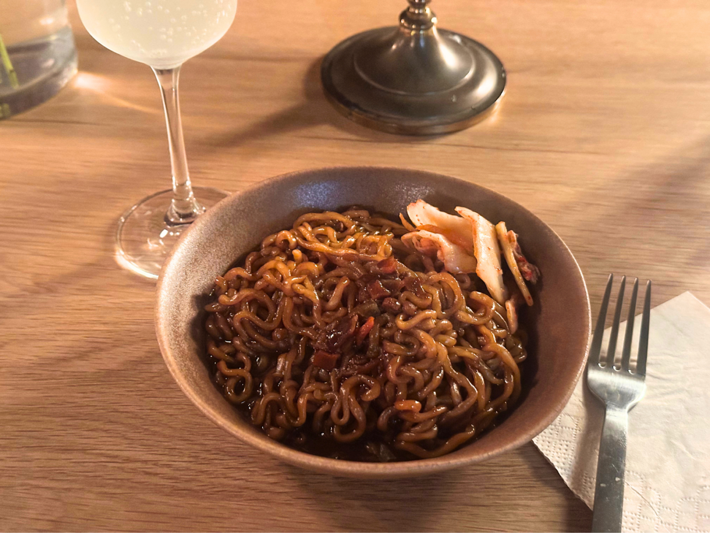 「歐美物價很貴,家裡都會有烤箱可以自己烘焙點心,我雖然不是專業的烘焙師,但是有一些經驗可以跟大家分享好吃的點心。」招牌紅絲絨蛋糕、軟Q巧克力豆餅乾,是 Sarah 心中的最愛。除了手工甜點,她也端出平常小酌必吃的療癒食物,便有了韓式炸醬麵配橘酒的神奇組合。那天 Sarah 特別幫我加了隱藏版的泡菜,提醒我一定要趁熱品嚐,我想這道料理之於她的意義,可能就像鹹酥雞配啤酒在台灣人心中的地位一樣絕配吧!