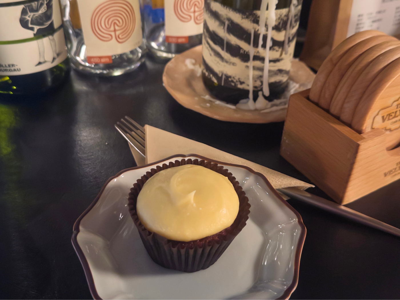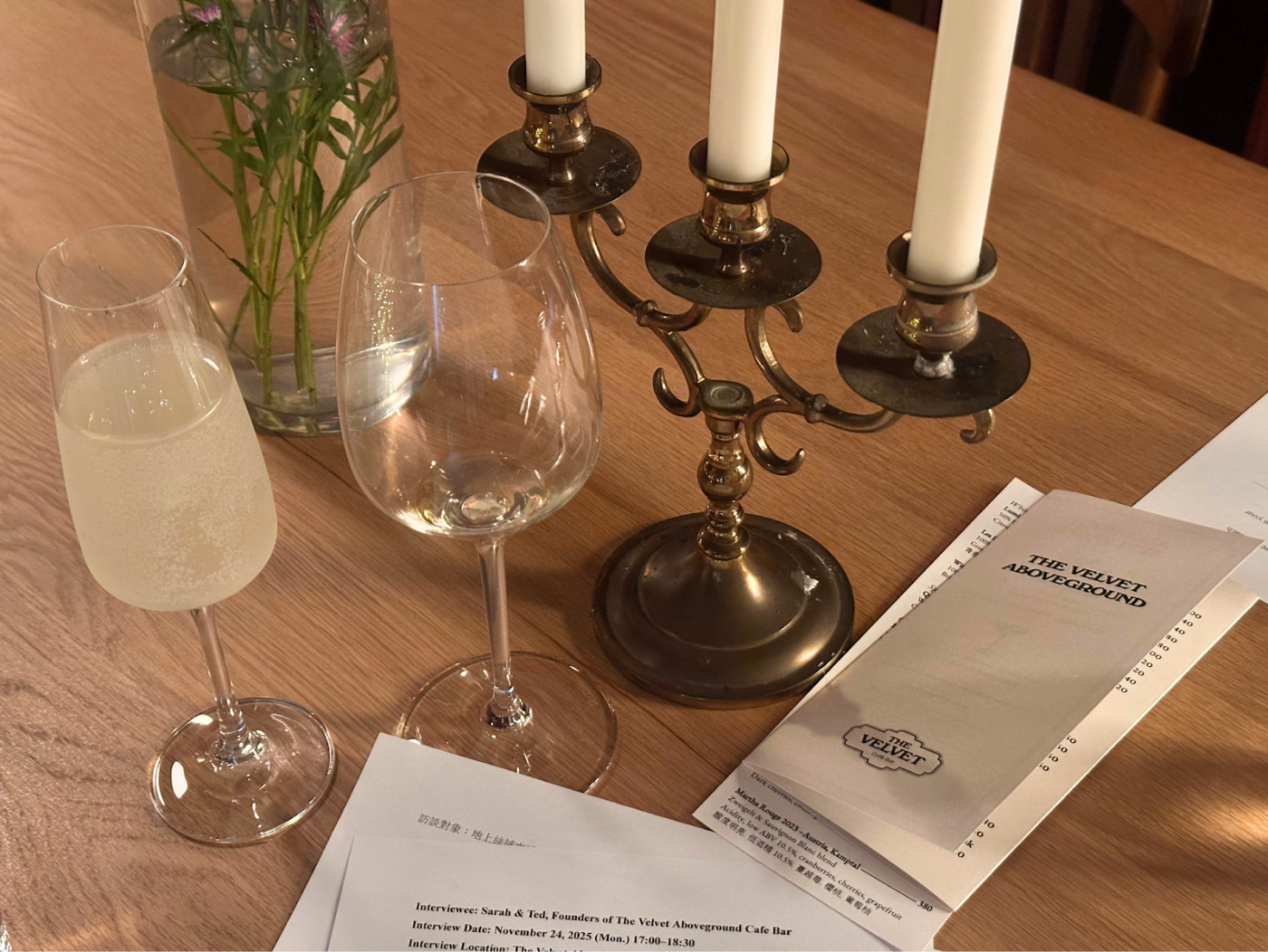 不同於大多歐風咖啡廳供應傳統酒為主,地上絲絨咖啡吧主打更加清爽、好入口的自然酒。訪談當天,Sarah 也熱情地與我分享了她私心最愛的一支橘酒。「台灣也有一些 european cafe,但是客群都偏老。」為了讓更多年輕人願意嚐鮮自然酒,除了將售價調低,他們也貼心地幫每一支酒製作名片,產地、酒精濃度、風味全部一目瞭然,非常新手友善。(註:傳統酒會加入二氧化硫讓酒保存得更久、越陳越香;自然酒則是不加或是加很少,味道比較自然、多變。科普知識 by Ted)