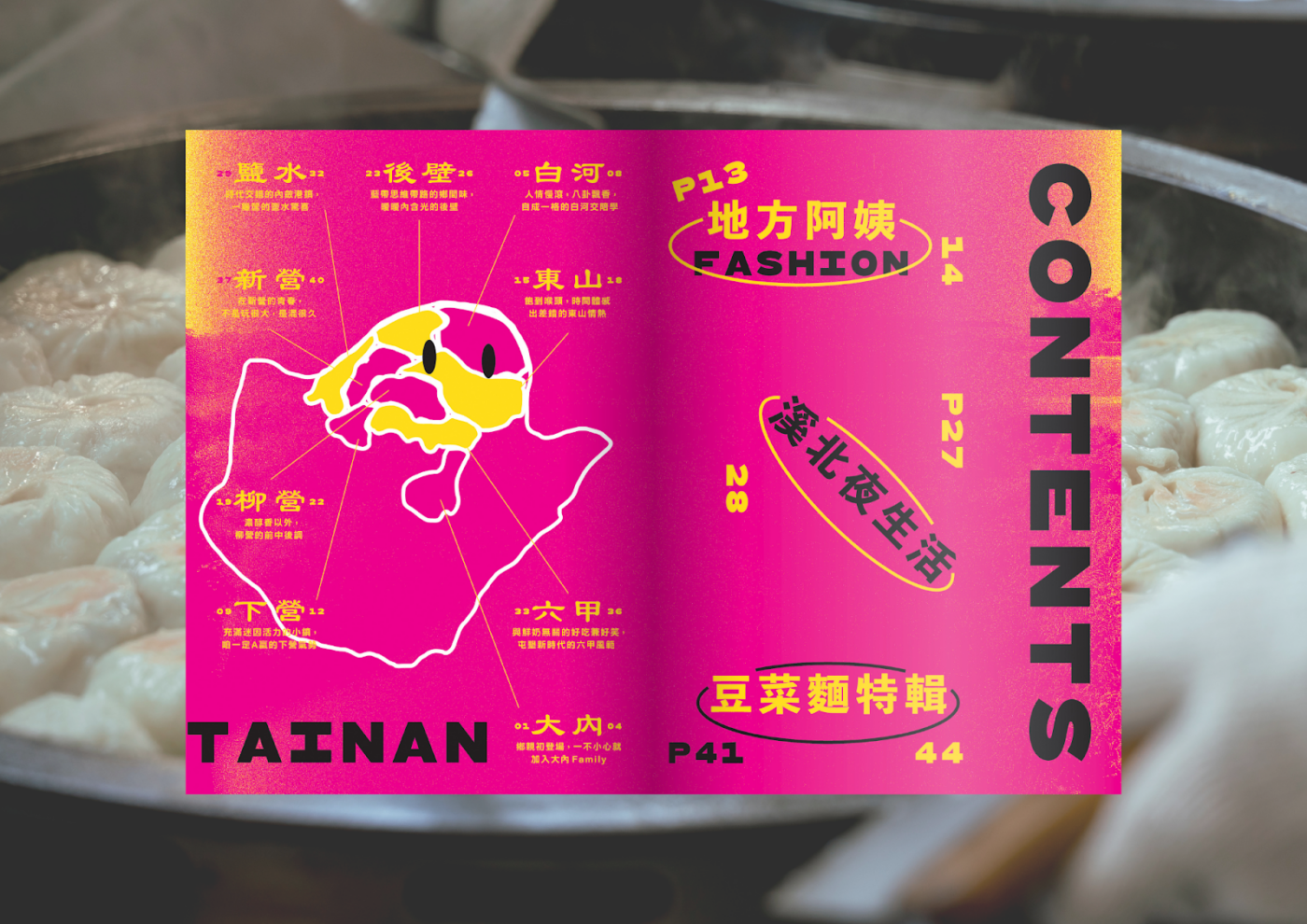 承襲《南》系列以食物作為探索的劃分,我們這次前進豆菜麵的大本營——「溪北」,於新營、六甲、大內、下營、鹽水、白河、後壁、柳營、東山等九個行政區,尋找不同於府城的台南意象及生活記憶。