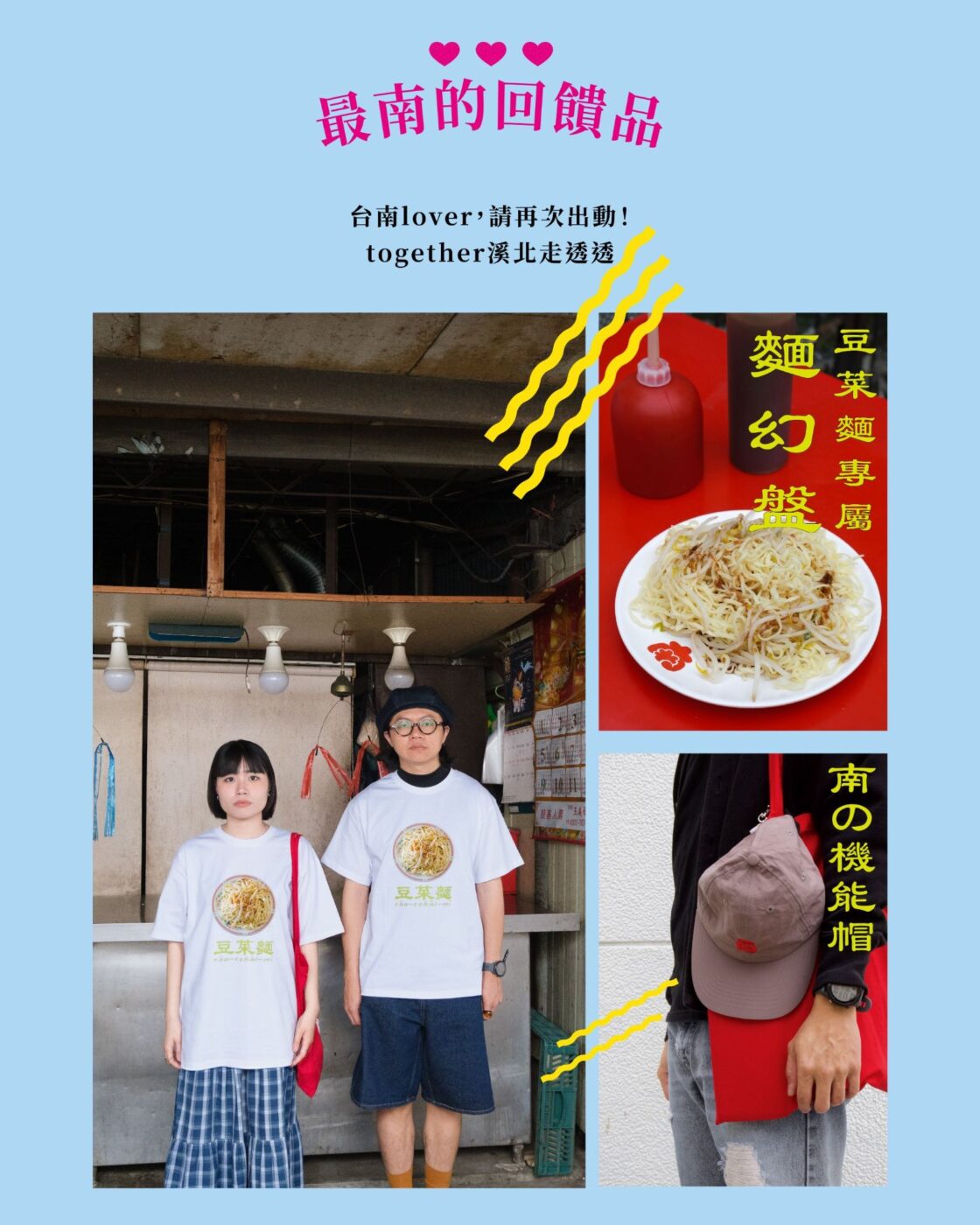 除了紮紮實實九個地區的散策筆記,以及〈地方阿姨Fashion〉、〈溪北夜生活〉、〈豆菜麵特輯〉等專題外,編輯團隊更與插畫工作者湯士賢攜手製作了隨書贈的海報,並推出周邊商品——豆菜麵專屬的「麵(mī)幻盤」;炎熱地區專屬的薄布料「南の機能帽」;一穿上就迷幻的俗擱大碗「豆菜麵T」,希望能讓讀者們有更完整的閱讀體驗。